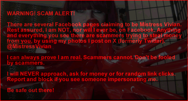 Whether you are looking for a show in your favorite fetish wear, i.e. leather, latex, pvc, a sensual tease in nylons and stilettos, a soft domination session with a gentle yet firm grip; or you will let me have my sadistic way with you... Mistress Vivian will be your new addiction.